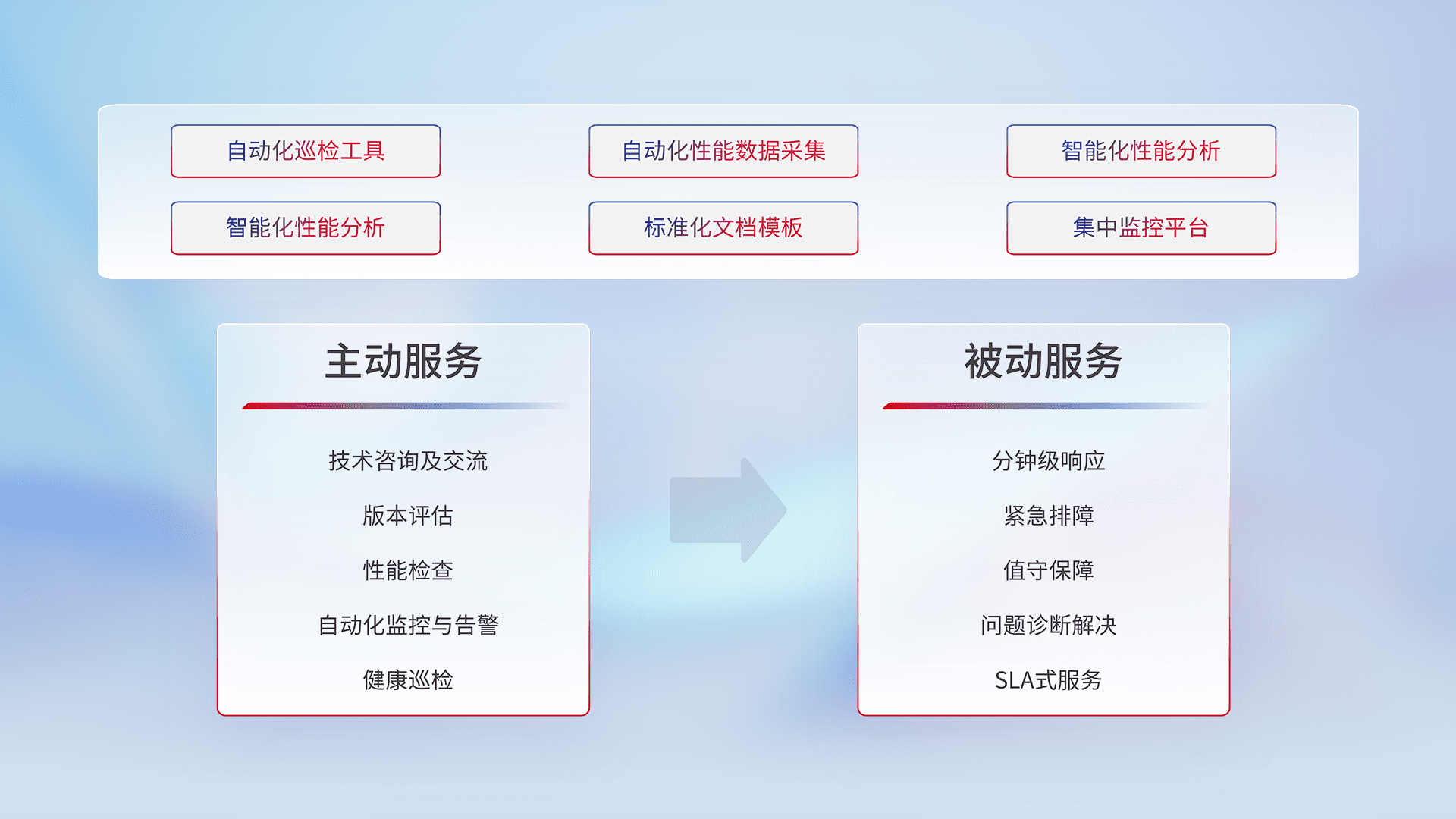 智能化工具和标准化文档,,保障服务质量,,提供主动服务(包含技术咨询、、、、版本评估、、、、性能检查、、、自动化监控与告警、、健康巡检)和被动服务包含(分钟级响应、、紧急排障、、值守保障、、、、问题诊断解决、、、SLA服务)。。